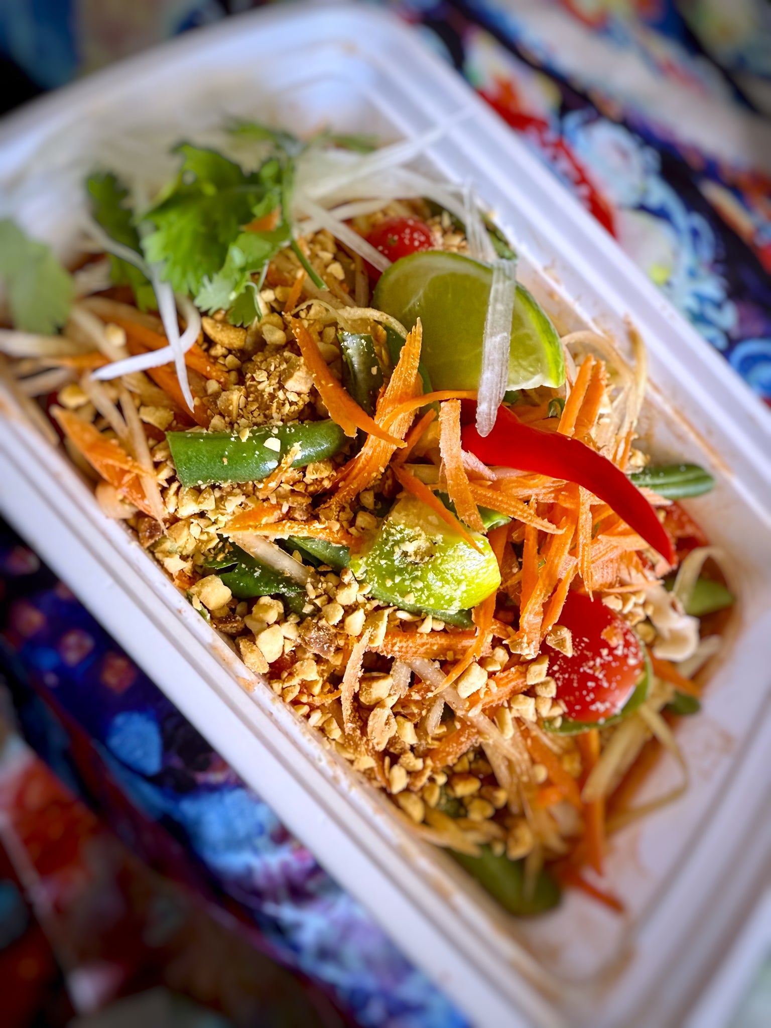 juliened fresh green papaya with roasted peanuts, carrot, tomato, chinese cabbage, tamarind dressing