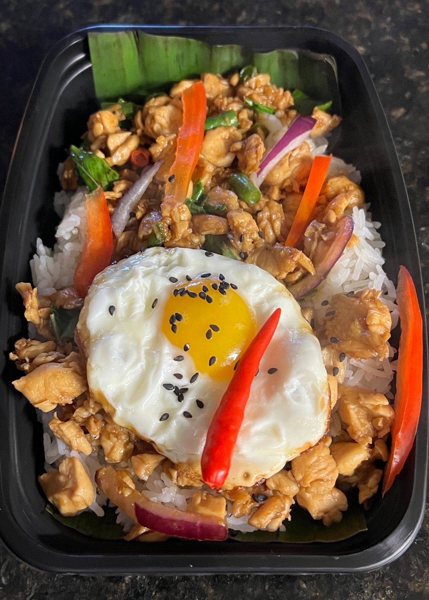 minced chicken or pork w chili garlic puree, long bean, onion and fried egg with house sauce. served on jasmine rice