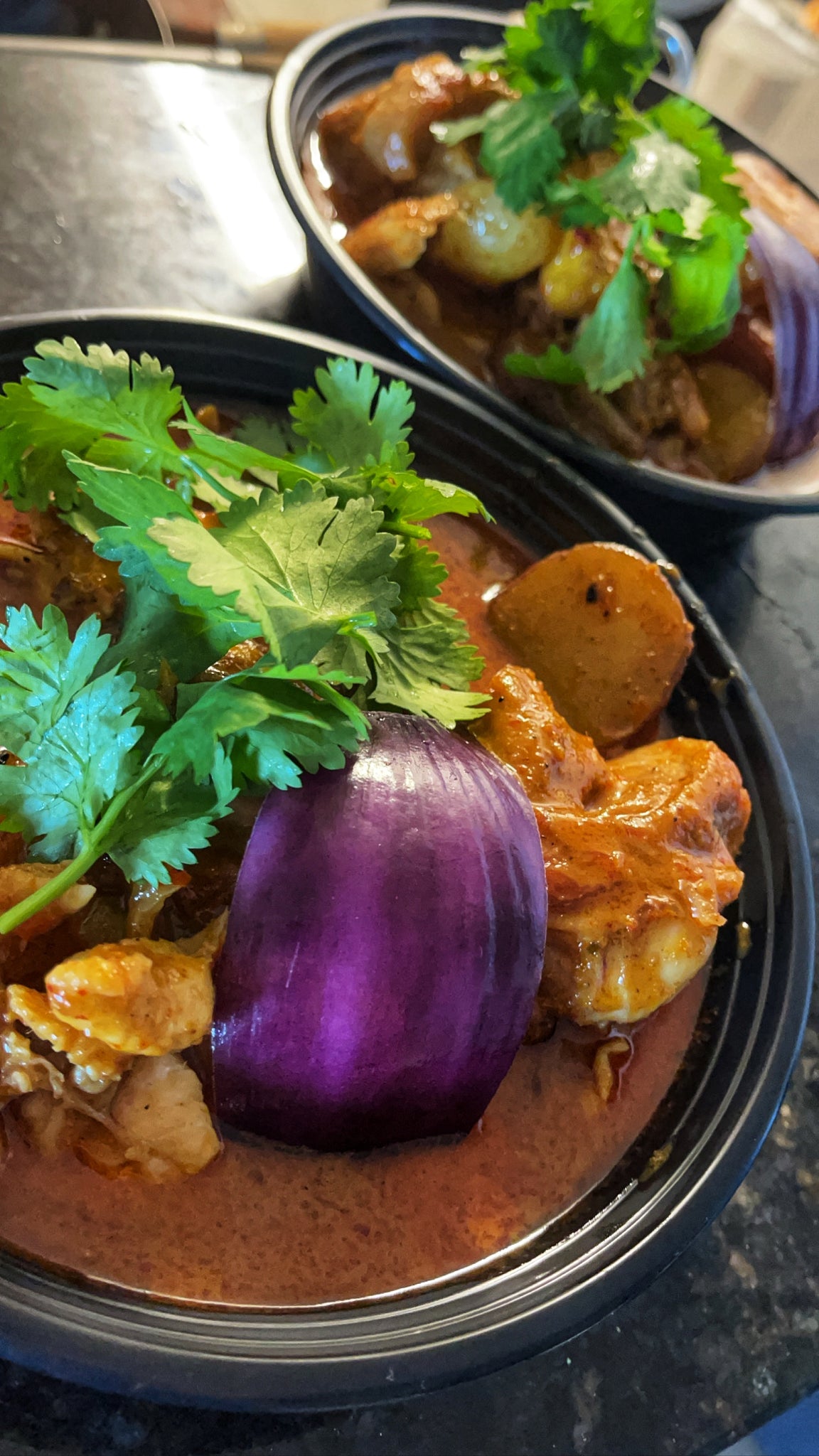 slow simmered vegan massaman curry with cinnamon, sweet potato, cauliflower, pineapple, pearl onion, topped with crispy roasted peanuts & fried shallots.